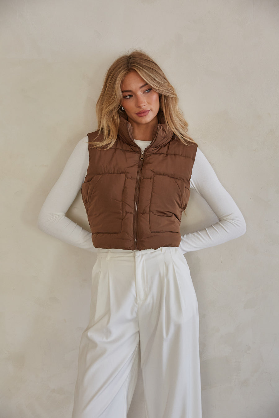 Layer up in the Emma Puffer Vest! This cozy piece features a butter soft fabrication, front pockets, plush padded make. Available in Brow, style with a long sleeve for a Winter ready look!