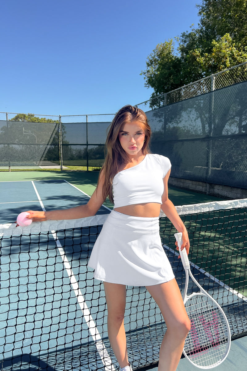 So cute in the Avery Smoothing Flare Tennis Skort! This tennis skort features signature butter-soft, smoothing fabric with four-way stretch, an ultra flattering flare silhouette, and lifting built in shorts with pockets. Available in pink, black, blue, and white. Complete the set with the !
