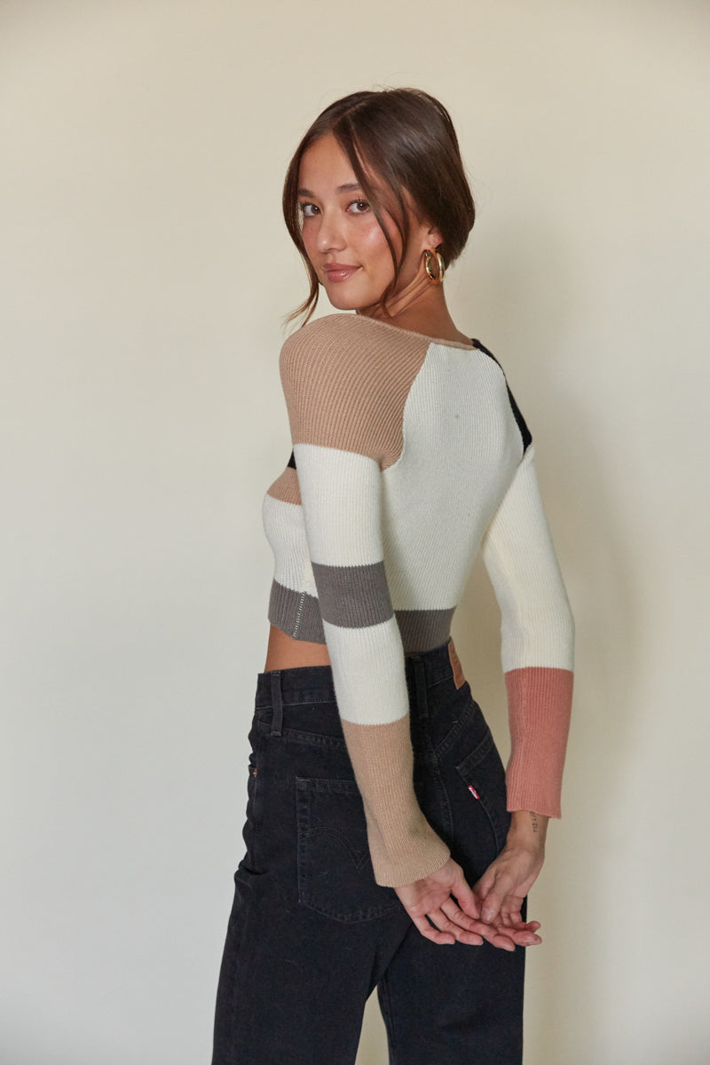 The Carina Long Sleeve Colorblock Sweater is a seasonal favorite! This trendy knit top features a colorblock design, square neckline, long sleeves, and a cropped hem. Pair with the to complete the look!