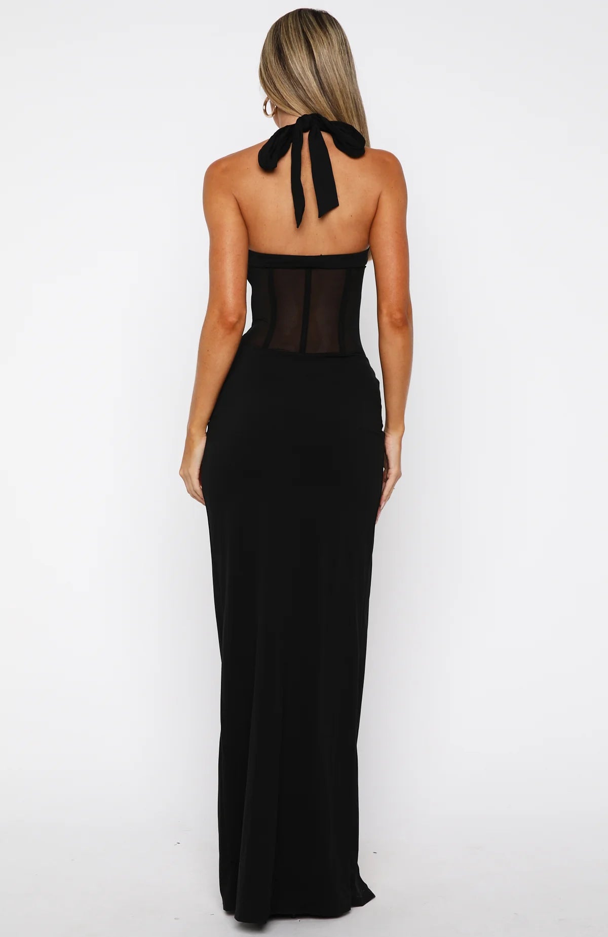 Flirty, fitted, and fabulous! The Champagne Promises Maxi Dress in Black features thick halter straps and a scoop neckline with under‑wire for lift, while internal boning sculpts the bodice. The sheer panel at the bodice adds a touch of daring, balanced by a twist knot at the front of the skirt and a front leg slit. Style with clear heels, layered gold jewellery and a top-handle bag for the perfect Moulin Rouge fit.