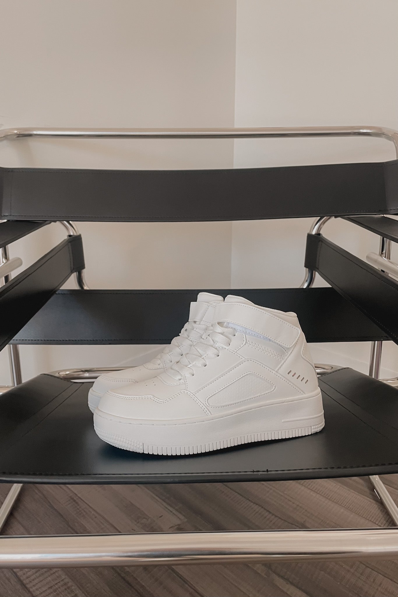 The Cora High Top Sneakers are a wardrobe staple! Featuring a platform detail and velcro strap, these shoes are the perfect trendy piece! Available in solid white and . Pair with some for the ultimate streetwear look!