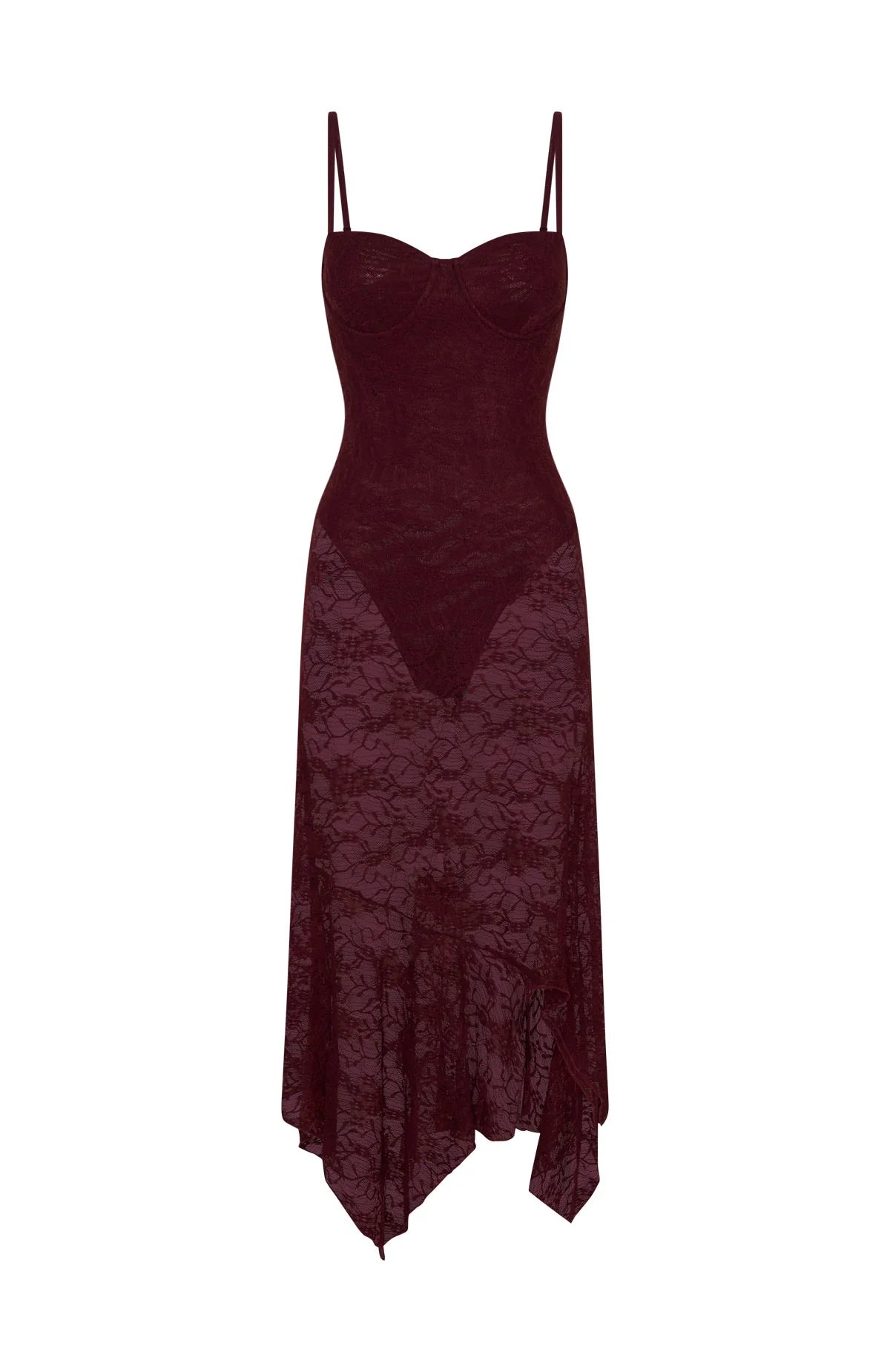 For strolls along the Arc de Triomphe, the Darling Girl Midi Dress in Port is your go-to! Featuring thin adjustable straps, a sweetheart neckline with built‑in bust cups, a fitted bodice, and an asymmetrical hemline, a built-in mesh bodysuit and discreet back zipper and hook‑and‑eye closure for a seamless finish. Style with clear heels and paired back earrings for an effortlessly chic look.