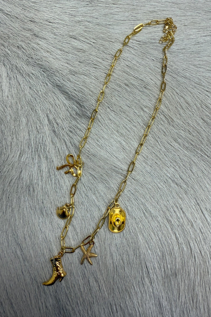 Elevate your casual outfit or add to your festival look with our Hannah Cowgirl Charm Pendant Necklace. With a playful link chain and quirky cowgirl charms, this necklace is sure to bring a touch of fun to any occasion. Available in gold for a trendy touch.