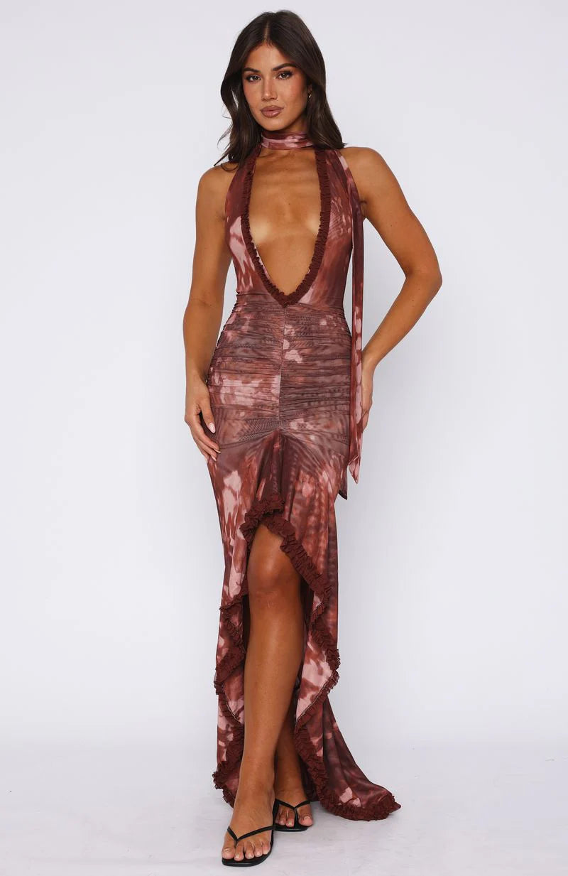 Make it YOUR moment in the Let It Ride Halter Maxi Dress in Burnt Umber! Features a separate neck scarf, halter neckline, ultra low plunge, front leg split with frill detailing, ruched detailing on waist, backless and invisible zipper with hook and eye closure. Complete this stunning look with gold accessories, heels and a shoulder bag.