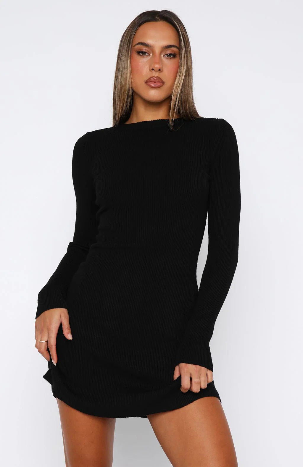 In focus: chic mini dresses. The Let's Be Together Long Sleeve Mini Dress in Black features a high neckline, long sleeves, hugging fit, mini length and stretch, stretch material for an easy slip on design. Put on a pair of knee high boots and a shoulder bag for your next 'drinks with the girls fit'!