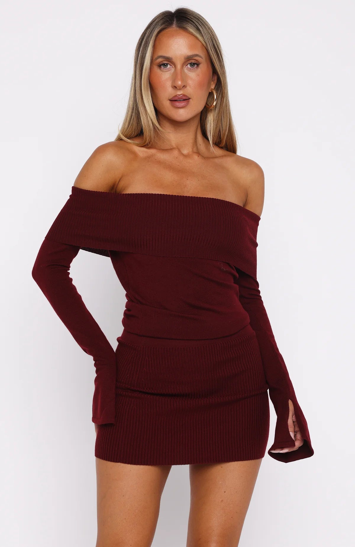 The Parental Guidance Knit Mini Dress in Burgundy is a must-have for cooler nights! Features a strapless neckline with grip tape, fold-over fabrication on bust, long sleeve with split cuff detailing and elastic waistband for a cinched fit. Style this fit to a tee with heels and simplistic jewellery for an elegant look we love!