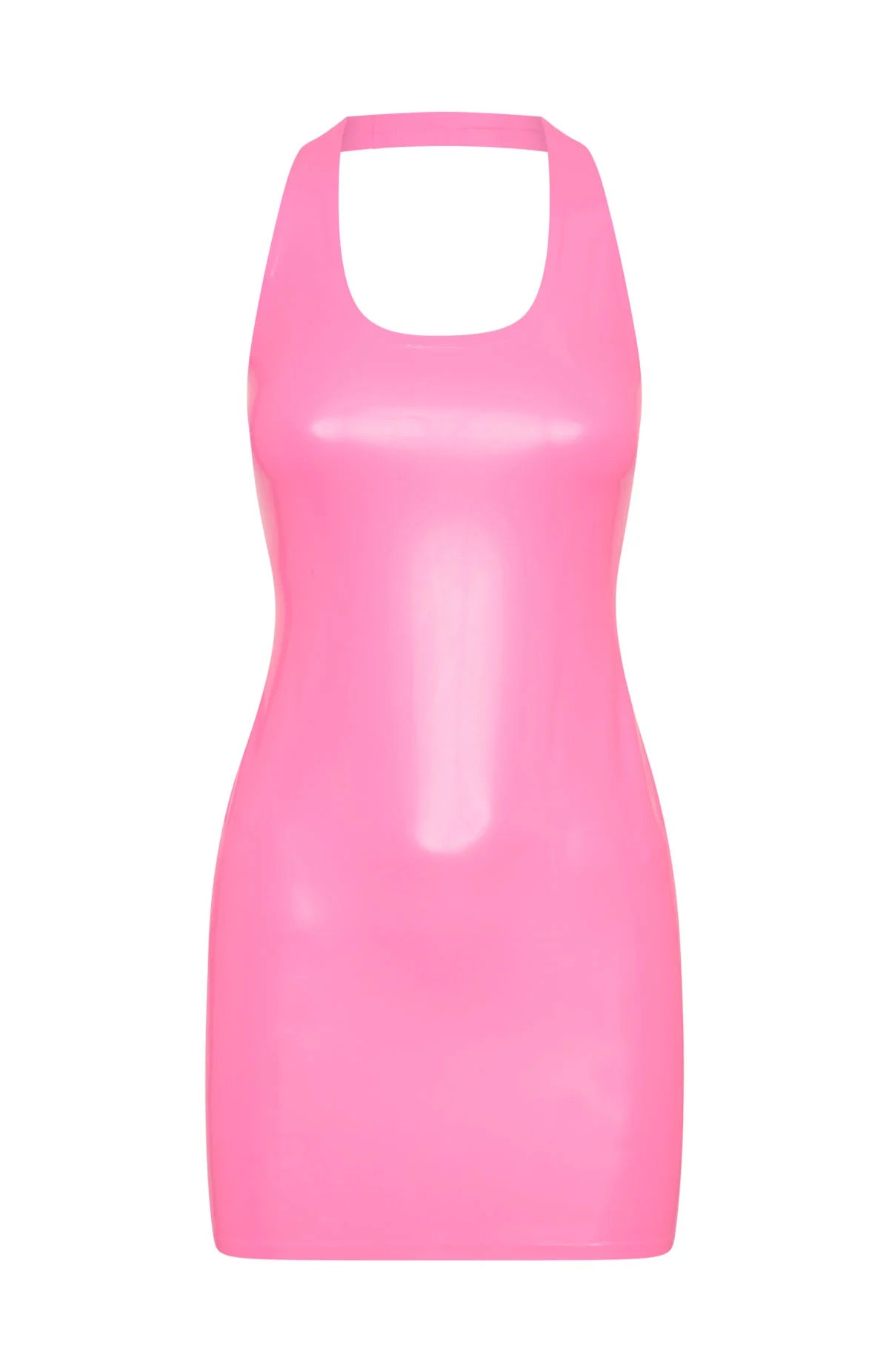 Hot pink looks this good: meet the Spell Breaker Latex Mini Dress in Hot Pink. Crafted from sleek latex with halter straps, a bold plunge neckline, a second‑skin silhouette, and a back zipper for a flawless finish. Style with clear mules and simple gold jewellery for a bday look we love.