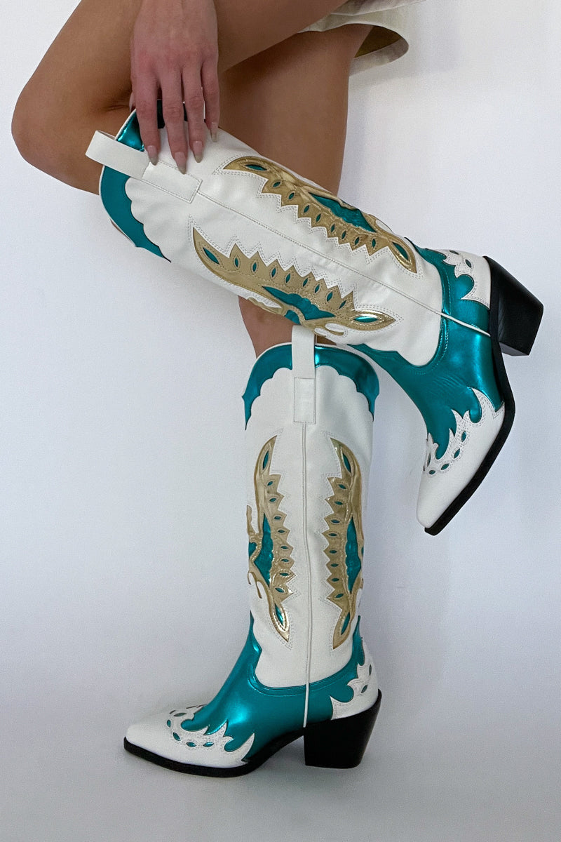 The cowgirl boots of your dreams just landed! The Azalea Wang Apolline Green Metallic Western Boot is a knee-high statement cowboy boot. Step out in style with this high-impact embroidered western boot. Featuring a white body with teal and gold metallic overlay details, and a black sole. Pair these boots with a cute for the perfect main character energy look!
