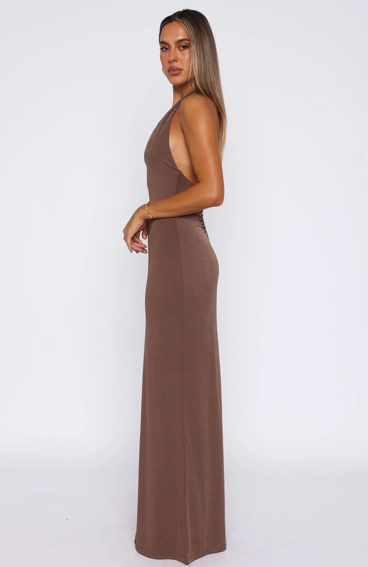 Glam up your weekend with the Written In The Stars Halter Maxi Dress Chocolate. Featuring a halter neck design, plunge V neckline, maxi length, backless, back ruched detailing, figure-hugging fit at bodice and buttery soft, stretch material. Pair with a kitten heel and gold jewellery for a look we adore!